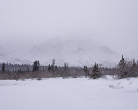 Drive to small Yukon community with friend and another friend. The clouds are low and there is a light snow falling. On the way see wild elk and horses.
